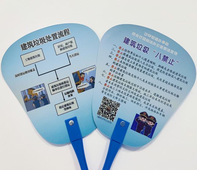 炎炎夏日,一把清涼小扇在手,還能學(xué)法?沒錯!針對高溫作業(yè)環(huán)境,沙坪街道精心定制“建筑垃圾普法清風(fēng)扇”,重點突出建筑垃圾處置的核心法律義務(wù)和禁止事項。執(zhí)法人員在開展“一對一”普法時,將這把兼具實用與普法功能的“法治清風(fēng)扇”送到工地負責(zé)人、裝修師傅、三輪車運輸人員等從業(yè)人員手中,讓普法對象能在炎炎夏日扇動清涼的同時,隨時“掃一眼”關(guān)鍵法律條款,在潛移默化中強化法律記憶、提升守法意識。