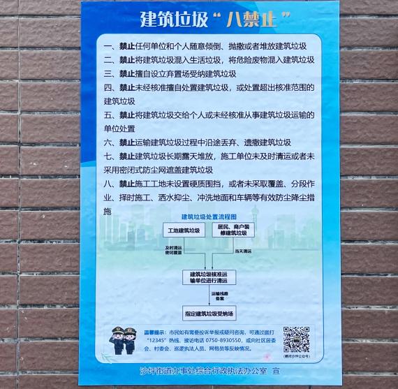 沙坪街道精心提煉了建筑垃圾管理中最核心、最高發(fā)的“八禁止”內(nèi)容(如禁止隨意傾倒、拋撒或者堆放建筑垃圾,禁止擅自設(shè)立棄置場受納建筑垃圾等),制作成簡潔、醒目、直白的宣傳海報,張貼在建筑垃圾產(chǎn)生的源頭(施工工地、裝修現(xiàn)場出入口)、運輸人員聚集點(三輪車??奎c),以及建筑垃圾偷倒“黑點”等關(guān)鍵區(qū)域。這些海報如同無聲的“法治崗哨”,時刻提醒著過往的相關(guān)責(zé)任主體哪些紅線絕對不能碰,有效擴大了普法的覆蓋面。